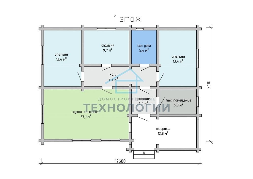 Такой домик, общей площадью 120,4 м2, будет хорошо смотреться практически на любом участке. Он наделен небольшой уютной террасой 12,8 м2, которая имеет навес для защиты от погодных явлений. Следом за ней располагается прихожая 4 м2 с выходом в холл 9,2 м2. По три стороны от него расположены спальни: 13,4 м2, 9,7 м2, 13,4 м2. Конечно, это только задумка архитектора, а вы можете использовать эти помещения так, как нужно вам. Вариативность у дома очень высокая, планировка рассчитана на это. К примеру, одну из спален можно переоборудовать в рабочий кабинет или комнату отдыха. Недалеко предусмотрена просторная и светлая кухня-гостиная 27,1 м2, о которой мечтала бы, пожалуй, любая хозяйка. Помимо этого, здесь есть санузел 5,4 м2, а также подсобное помещение 6 м2. Такой дом отлично подойдет, как для постоянного, так и для сезонного проживания и приобретая его, вы гарантированно не пожалеете о вложении.