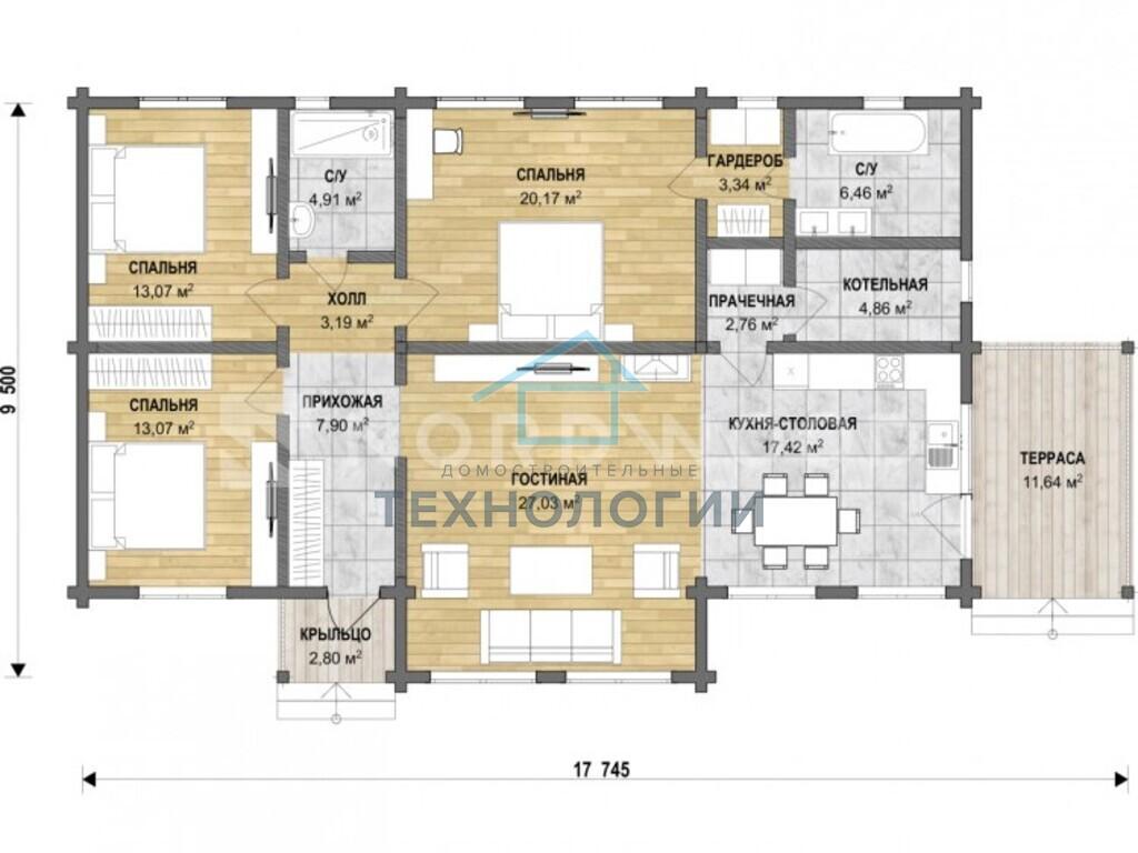 Этот проект — оптимальное решение для тех, кто ценит комфорт, практичность и современный внешний вид. Одноэтажный дом из бруса с продуманной планировкой и террасой подходит для круглогодичного проживания, обеспечивая высокий уровень удобства и качества жизни на долгие годы.